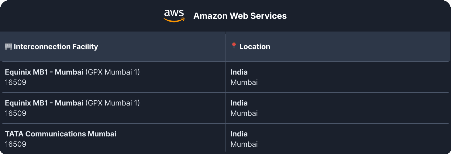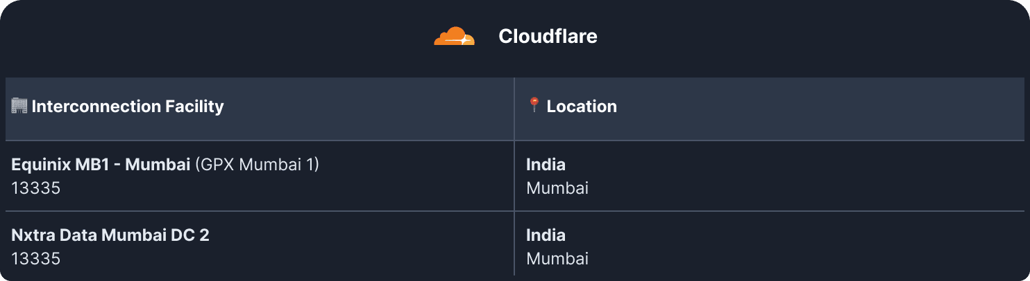 Cloudflare BOM(孟買)PoP 也在 Equinix MB1 設施進行對等互聯,因此 Cloudflare 和 AWS 在孟買的設施之間的網路距離非常短。