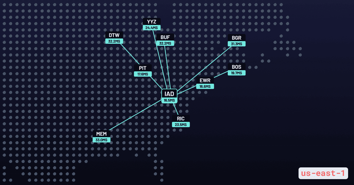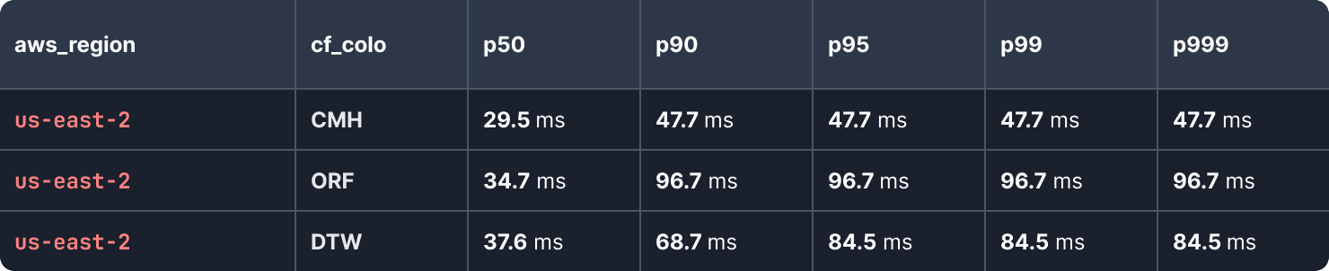 相比之下,俄亥俄州哥倫布市的 us-east-2 AWS 區域與同樣位於哥倫布市的最近的 Cloudflare PoP CMH 的 p50 延遲幾乎是其三倍。