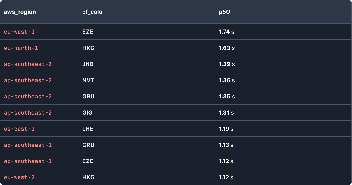 Prisma Accelerate 是一個全球資料庫快取,可提高部署在多個區域並與中心資料庫通訊的網站的效能。因此,我們觀察到幾乎所有 Cloudflare PoP 到任何指定 AWS 區域的流量。以下是我們觀察到延遲最高的 AWS 區域和 Cloudflare PoP 對: