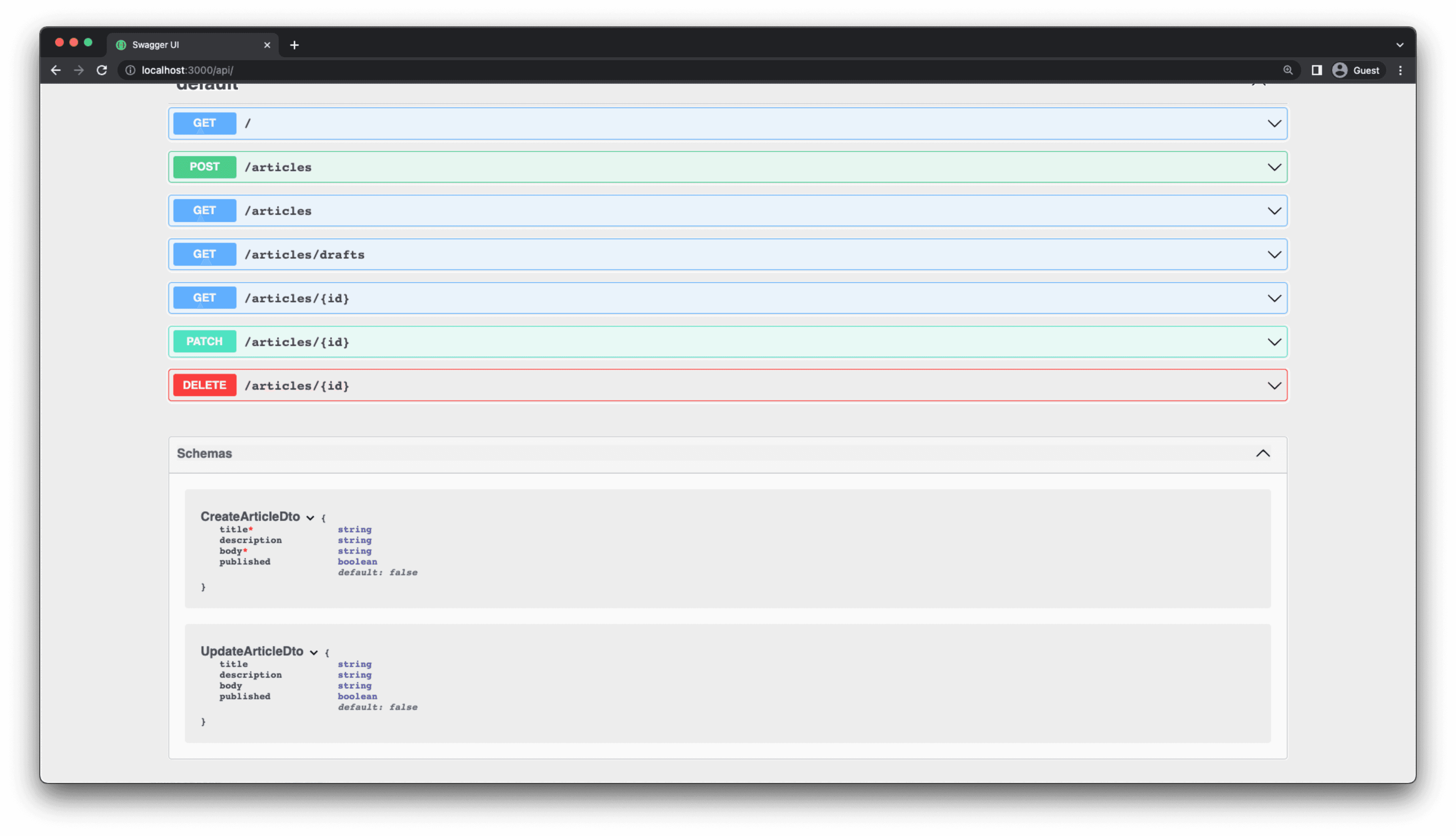 The CreateArticleDto 現在應該在 Swagger API 頁面中的 Schemas (模式) 下定義。UpdateArticleDto 的形狀是根據 CreateArticleDto 的定義自動推斷的。因此,UpdateArticleDto 也在 Swagger 中定義。
