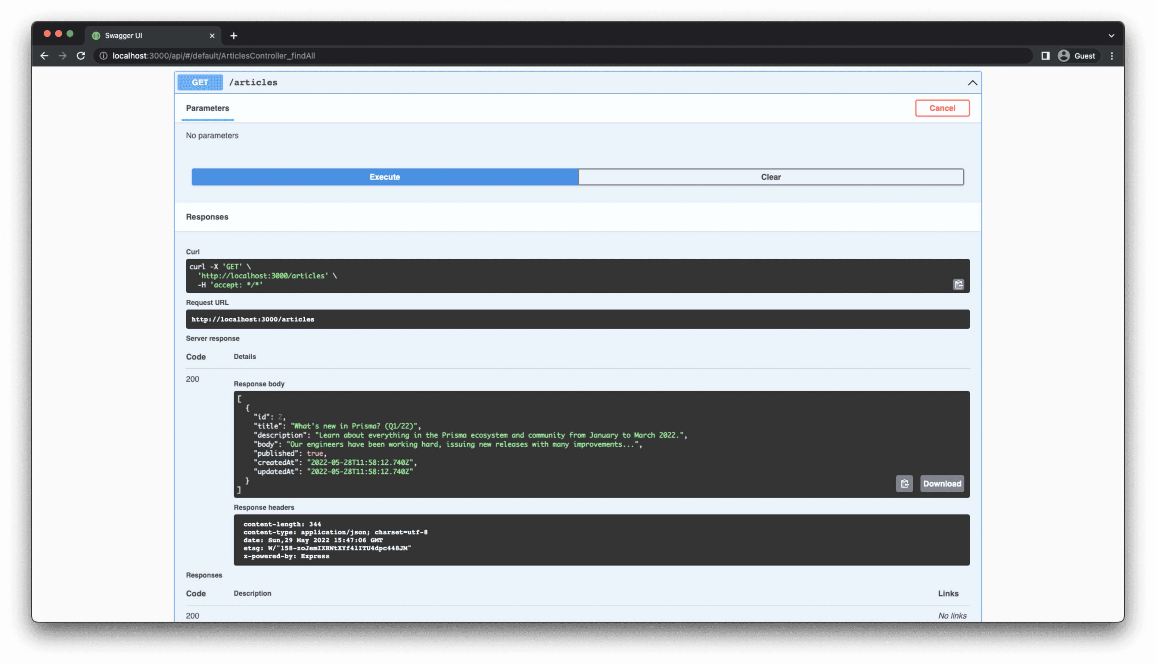 您可以透過訪問 https://:3000/api 並點選 GET/articles 下拉選單來測試該端點。點選 Try it out (嘗試一下),然後點選 Execute (執行) 以檢視結果。