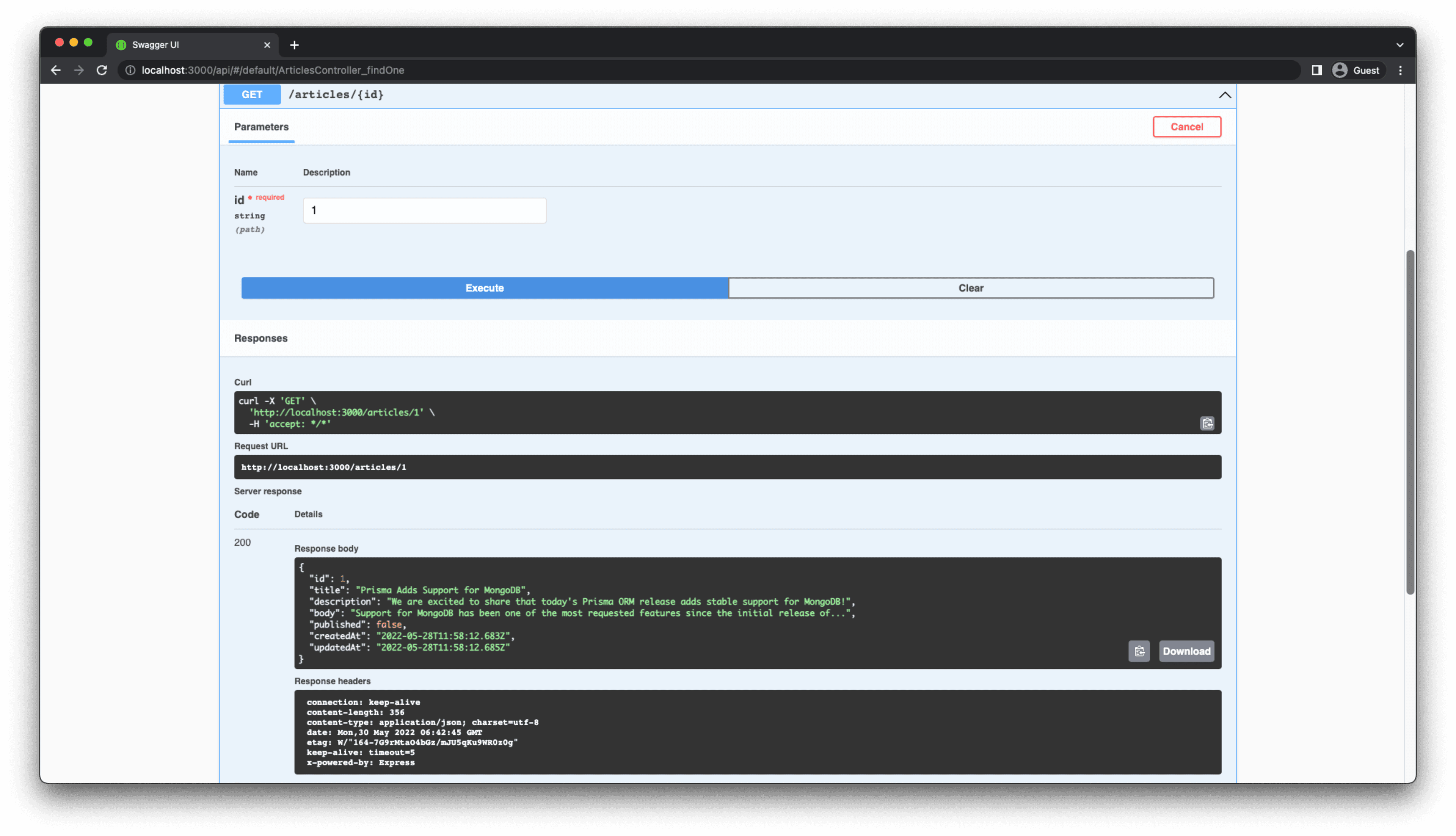 再次,透過訪問 https://:3000/api 來測試該端點。點選 GET /articles/{id} 下拉選單。點選 Try it out (嘗試一下),為 id 引數新增一個有效值,然後點選 Execute (執行) 以檢視結果。