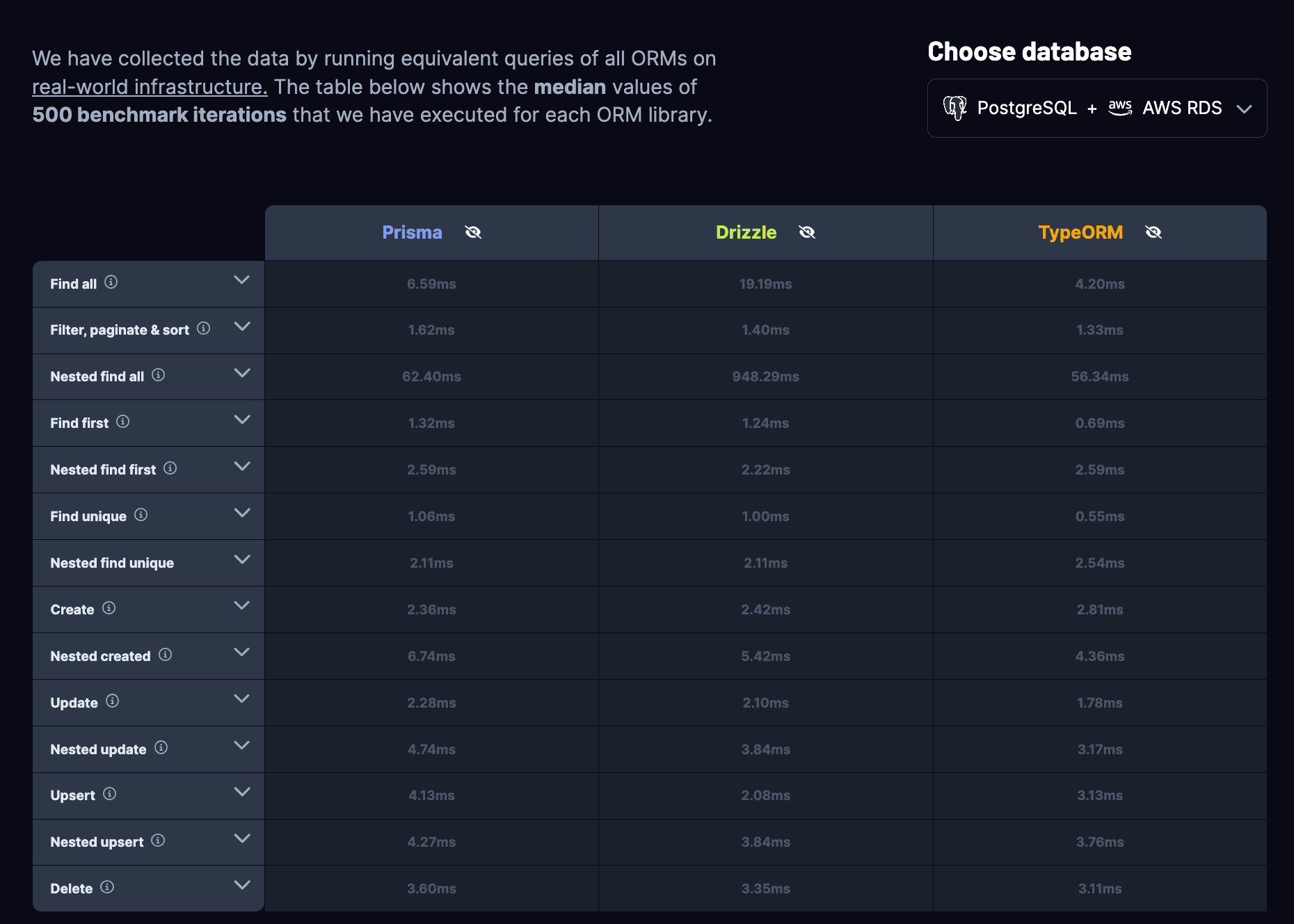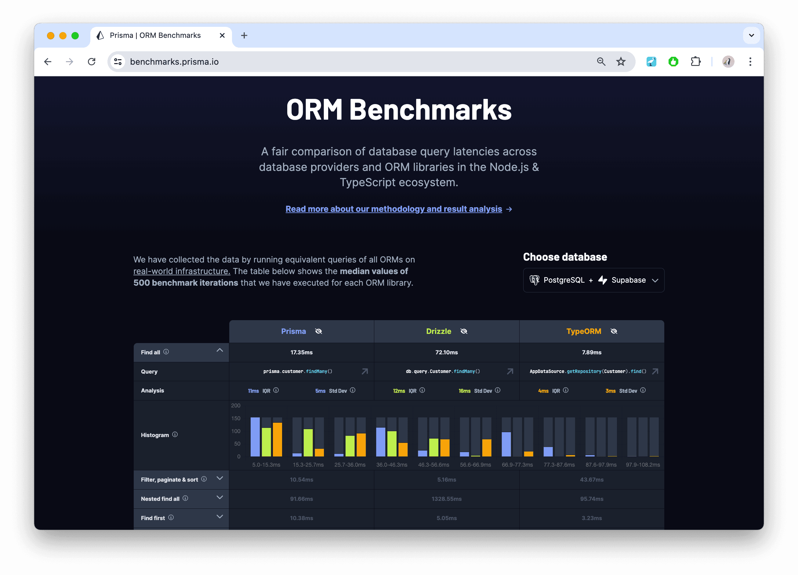 您可以在https://benchmarks.prisma.io上找到我們的基準測試結果。檢視它們,並在X和Discord上告訴我們您的想法。我們特別期待聽到您認為如何能使這個基準測試對您更有幫助,並歡迎改進建議!