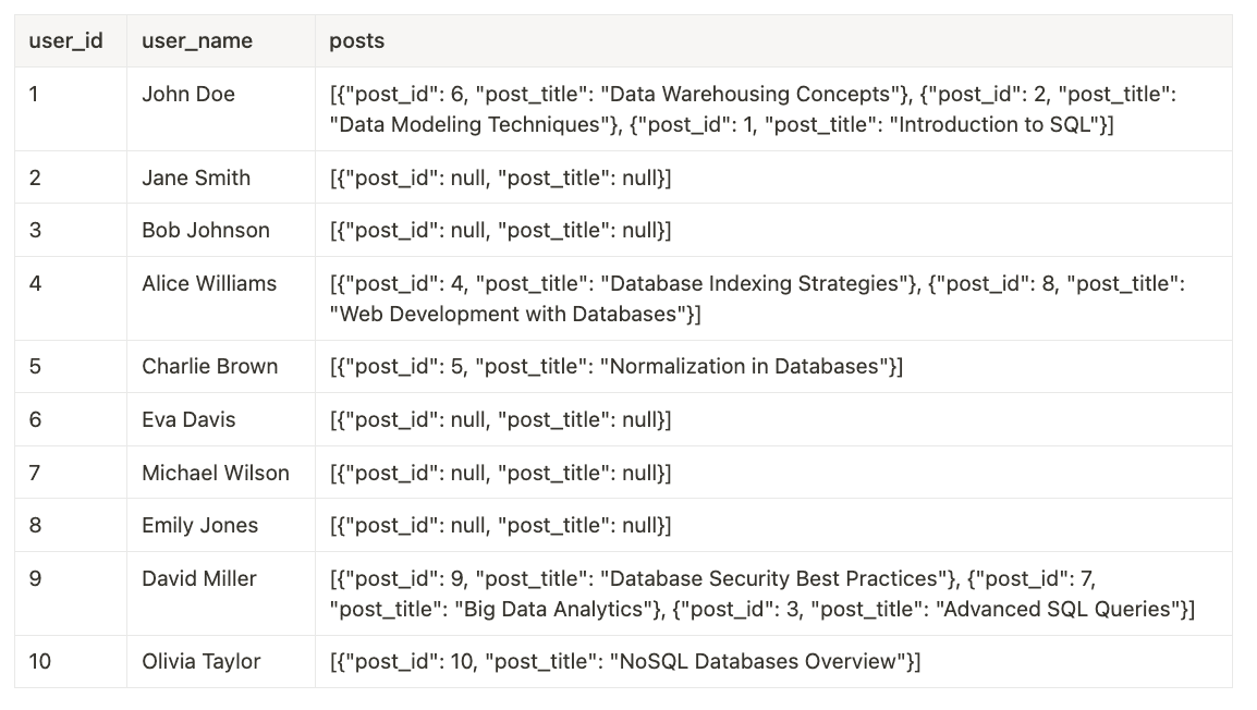這是一個 PostgreSQL 的示例,它使用 json_agg 和 json_build_object 來解決冗餘問題,並以 JSON 格式返回每個使用者的帖子。