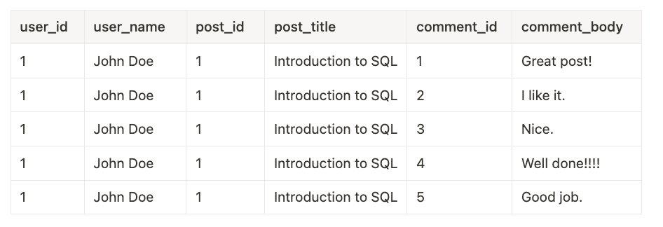 請注意本例中 user_name 列的冗餘。連線的表越多,這種冗餘就會越嚴重。例如,假設有另一個 Comment 表,其中每個評論都有一個指向 Post 表中記錄的 postId 外部索引鍵。
