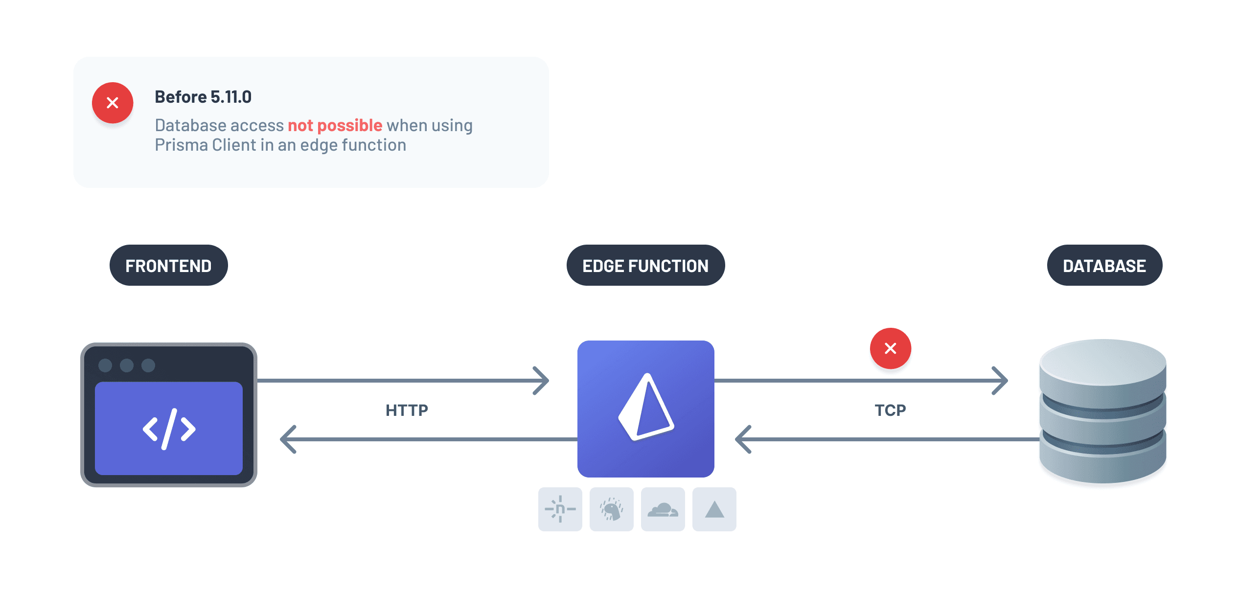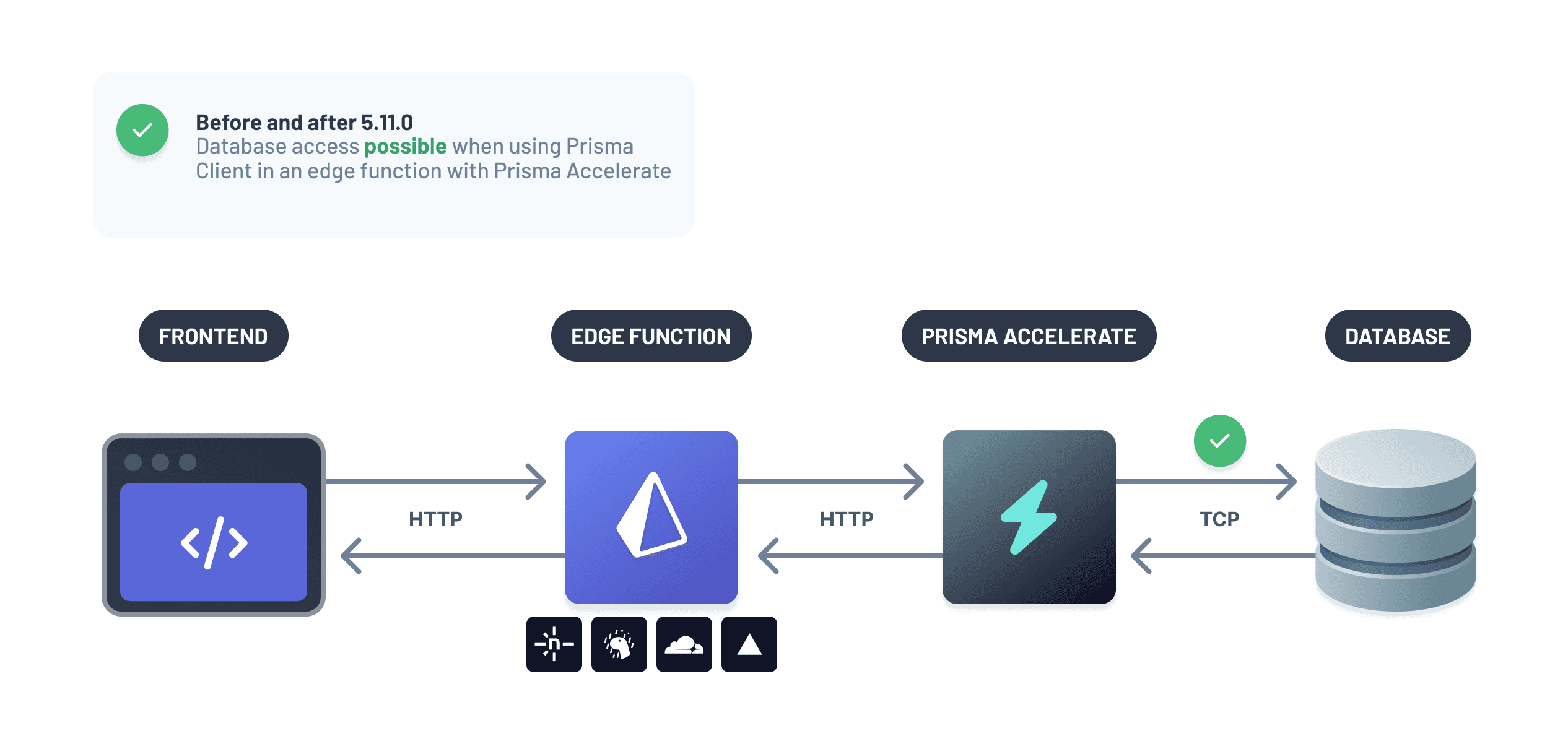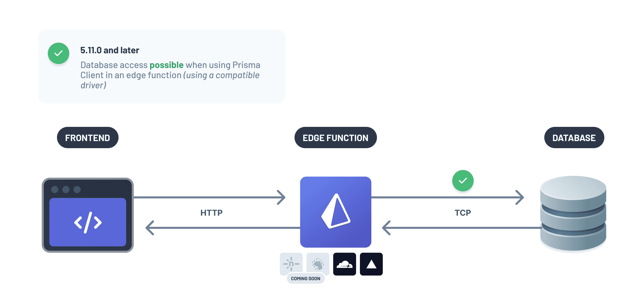 儘管在早期版本中可以在邊緣函式中使用Prisma ORM,但這始終需要使用Prisma Accelerate作為邊緣函式和資料庫之間的代理。
