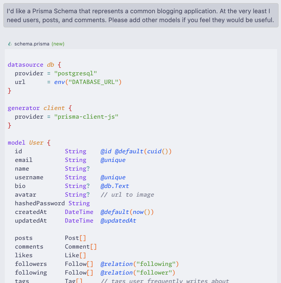 PSL 清晰一致的語法非常適用於 LLM 進行除錯或模式遷移等任務。其結構使 LLM 易於理解模式並提出更改建議,例如更新關係或新增模型,而無需太多額外資訊。