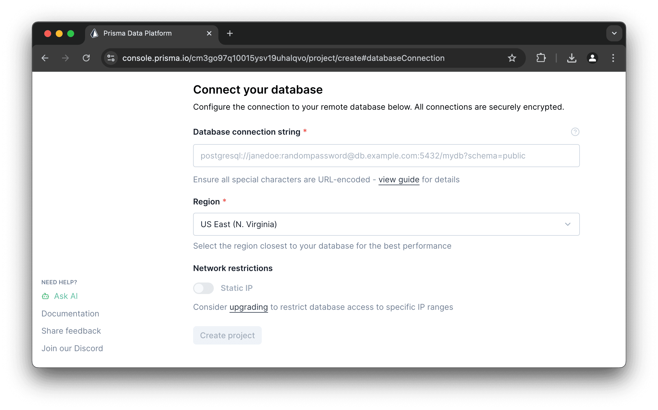 - 選擇 Prisma Postgres 並點選“Create project”(建立專案)