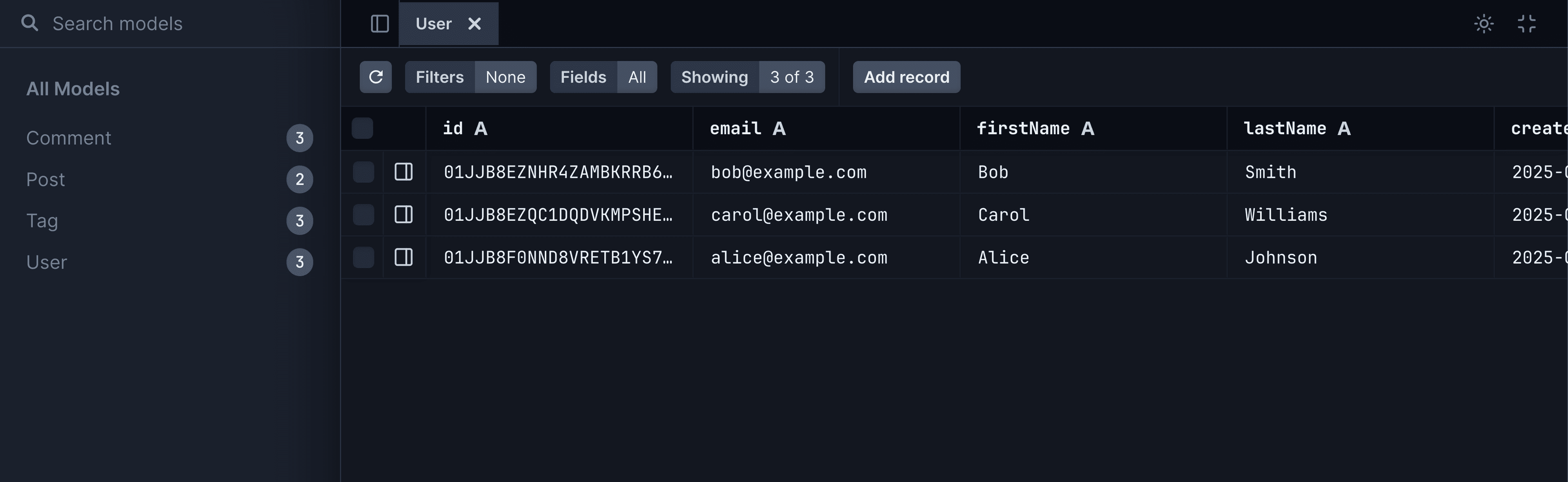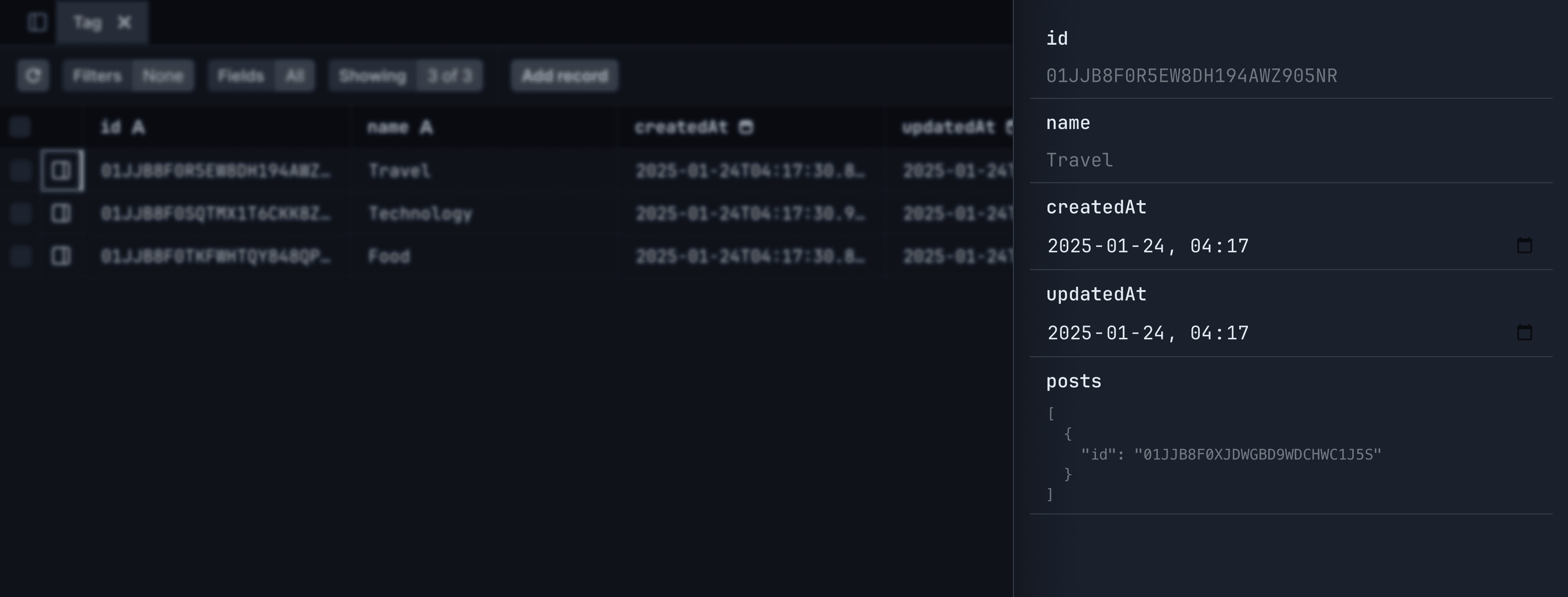 如果您在 Prisma Studio 中檢視和編輯不同模型之間的資料,您可能遇到過需要返回主模型列表的情況,這會讓您脫離當前正在處理的模型上下文。我們重新調整了 UI,現在您的模型列表將從左側以側邊欄的形式開啟。這讓您在尋找下一個要處理的模型時能夠保持工作流暢性。