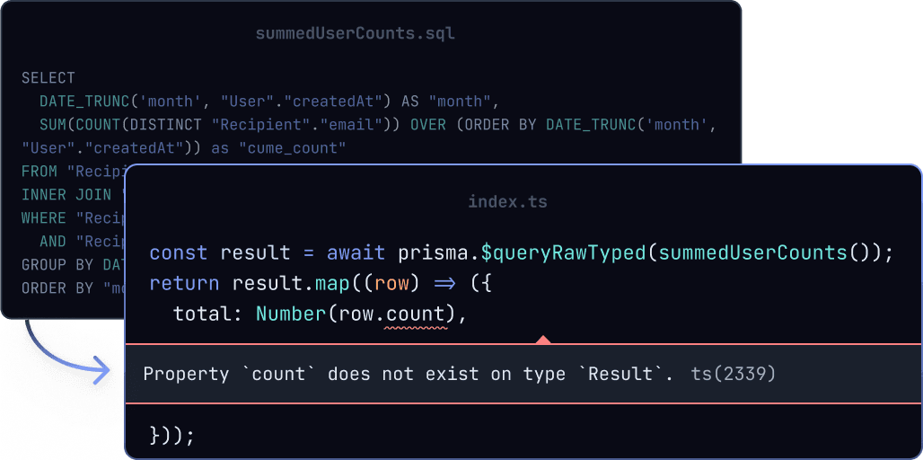 直接對資料庫執行SQL查詢,同時不失Prisma的型別檢查和自動補全優勢。TypedSQL 利用Prisma Client 的能力來編寫在編譯時進行型別檢查的原始SQL查詢。