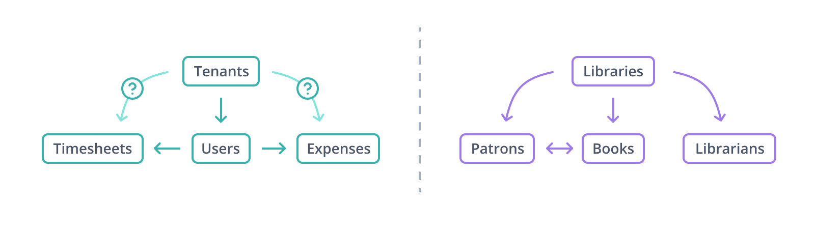 實體和關係構成了一個有向的節點和邊圖。這裡的“有向”意味著邊是單向連線。一個帶有 tenant_id 值的記錄,既暗示了 tenants 表的存在,也暗示了其中特定記錄的存在(如果設定了正確的外部索引鍵約束,則是保證而非暗示!);然而,一個來自 tenants 本身的記錄,卻不暗示任何其他資料可能屬於它。