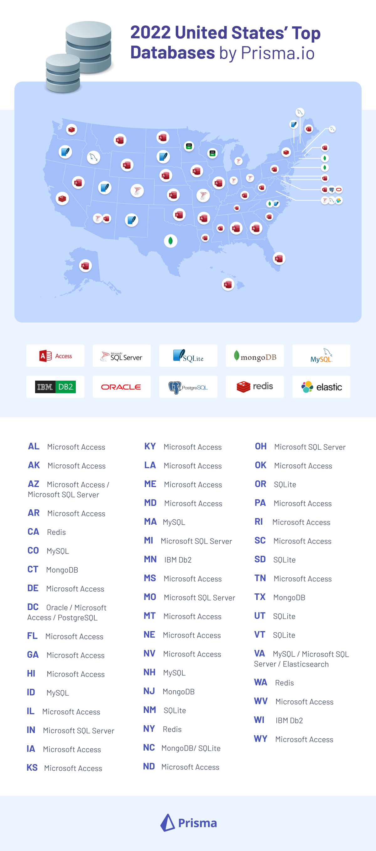 - Microsoft Access 是全國最受歡迎的資料庫,在 26 個州排名第一。