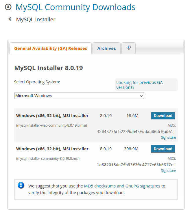 訪問 MySQL 下載頁面查詢安裝程式的連結