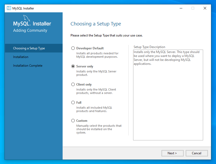 對於最小化安裝,僅伺服器選項包含您所需的所有元件。儘管名稱如此,此選項也包括 mysql 命令列客戶端。做出選擇後,點選 Next。
