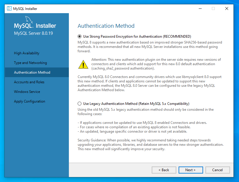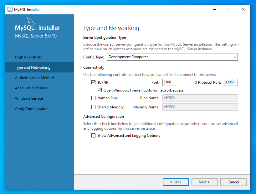 第一個配置選項是選擇安裝的可用性級別。由於這是本地安裝,請選擇 Standalone MySQL Server / Classic MySQL Replication。