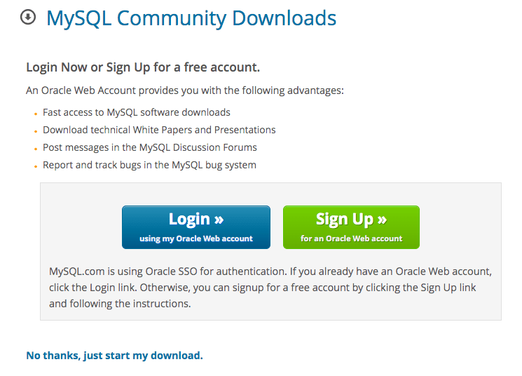 接下來,您將可以選擇建立 Oracle Web 賬戶。您可以點選頁面底部的 不用了,謝謝,只需開始我的下載 來跳過此步驟