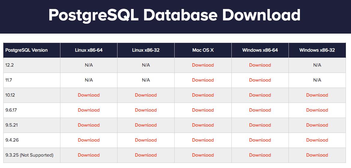 在接下來的頁面中,在 Windows x86-64 或 Windows x86-32 列(取決於您的計算機架構)中,選擇您希望安裝的 PostgreSQL 版本。
