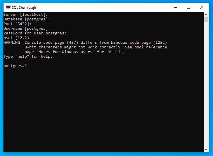 在您的開始選單中,輸入 psql 並點選該工具啟動程式。系統將提示您輸入要使用的連線詳細資訊。