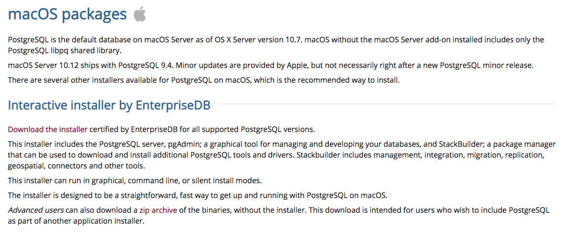 訪問 PostgreSQL macOS 安裝頁面 查詢安裝程式的連結。點選 Interactive Installer by EnterpriseDB 部分開頭的“下載安裝程式”。