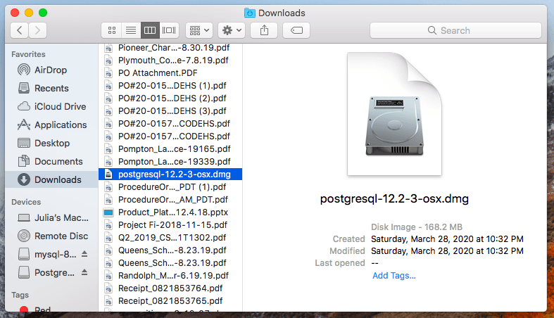 下載完成後,在“下載”資料夾中找到 PostgreSQL 安裝程式 DMG 檔案。雙擊下載的 DMG 檔案以掛載安裝程式歸檔。
