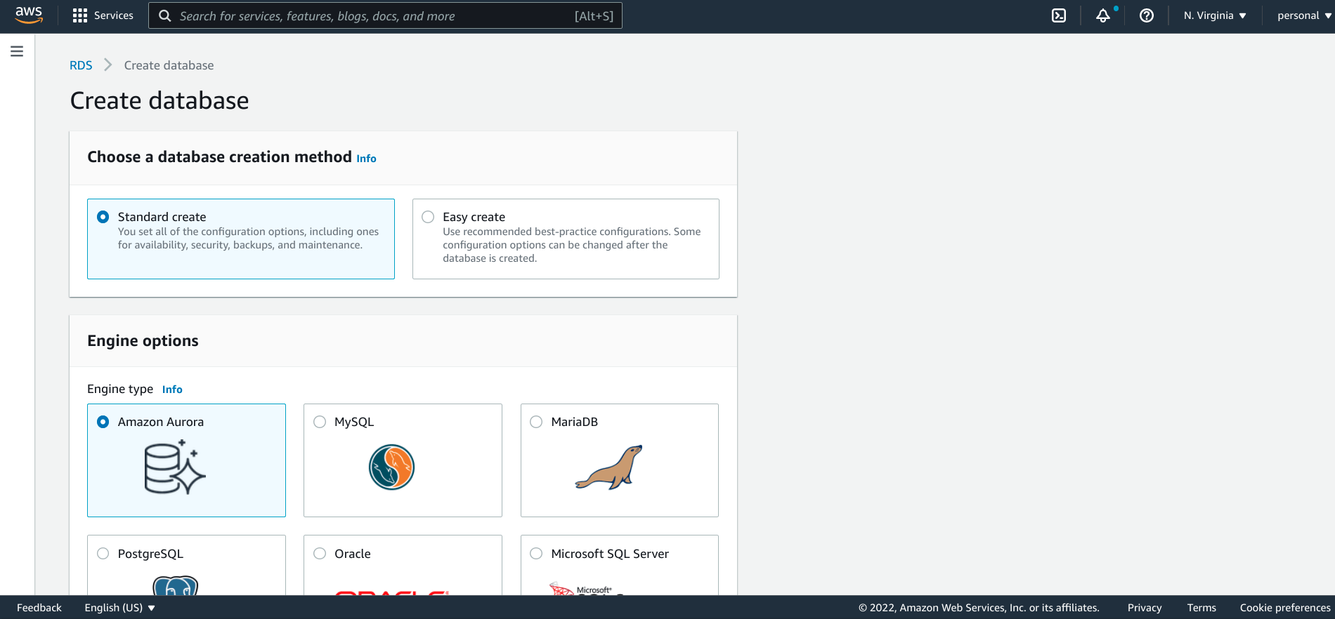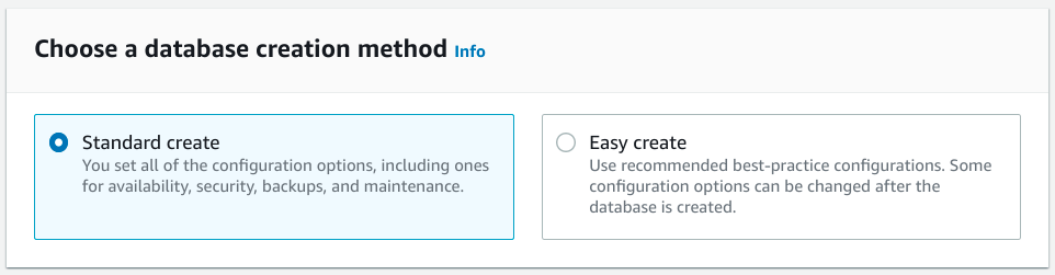 RDS 建立過程的第一部分決定了您希望如何配置資料庫,以及新資料庫的基本屬性,如資料庫引擎、部署型別和基本配置。我們開始吧。