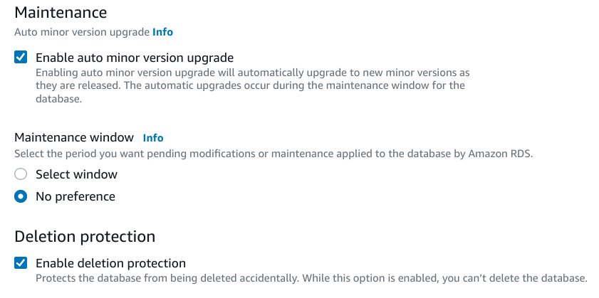 為您的生產資料庫啟用刪除保護總是一個好主意。這透過要求您在成功處理刪除之前恢復此選項,從而防止您意外刪除資料庫例項。對於大多數用例來說,沒有合理的理由選擇退出此選項。