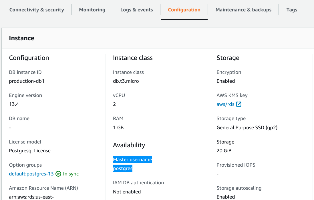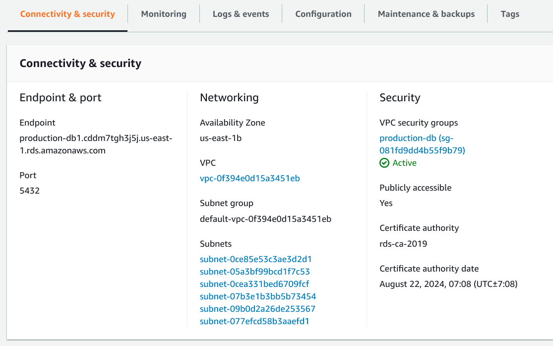 在此示例中,我們的端點名稱(主機 URL)是 production-db1.cddm7tgh3j5j.us-east-1.rds.amazonaws.com,我們的資料庫正在監聽 PostgreSQL 的標準埠:5432。