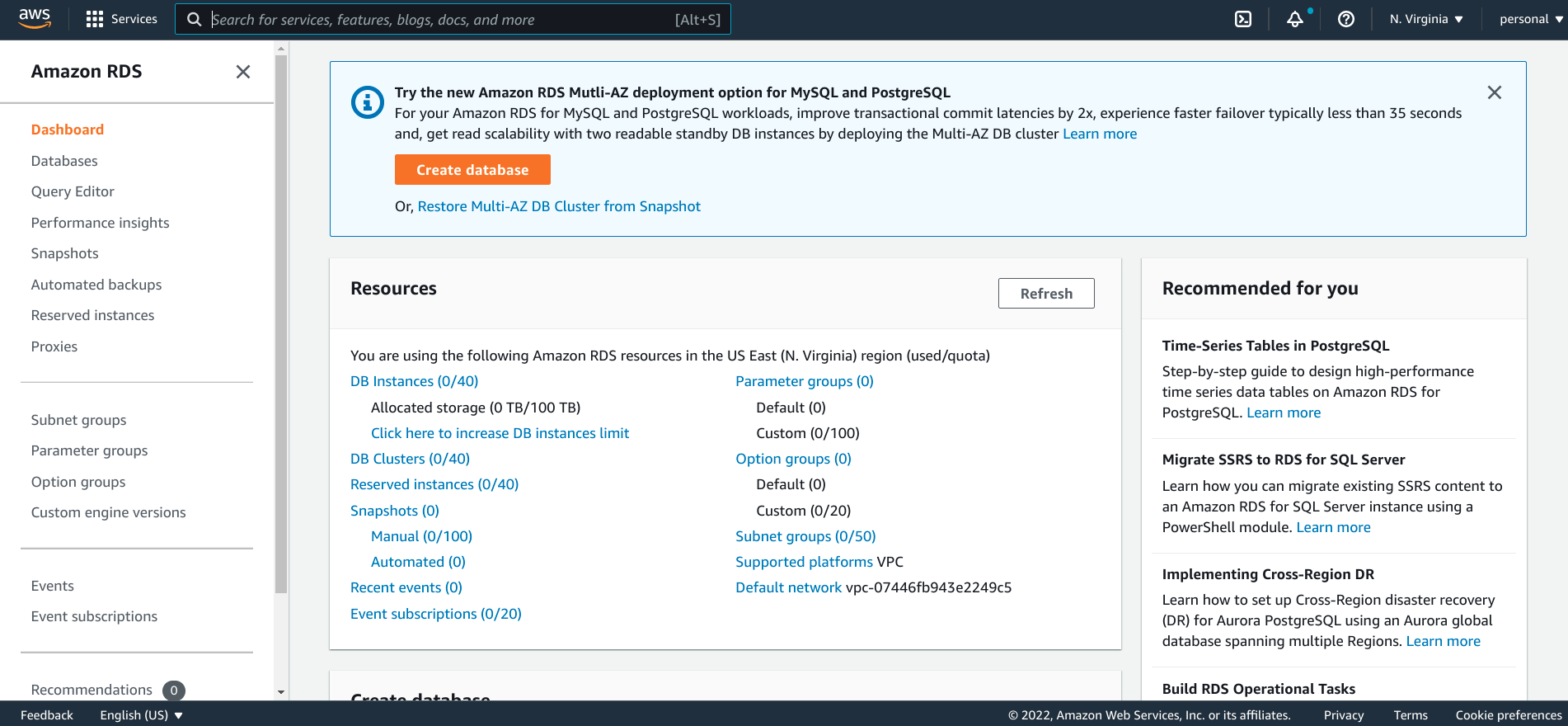 當您的例項準備就緒時,它將顯示在 RDS 控制面板的資料庫部分