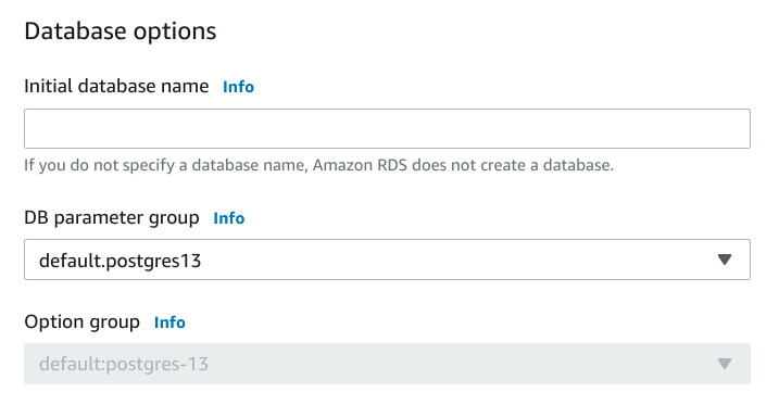 如果您願意,可以選擇讓 RDS 自動為您的部署建立一個初始資料庫。這通常是不必要的,因為您執行的任何遷移或其他設定指令碼通常都會在例項中建立必要的資料庫結構。