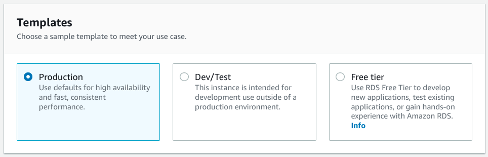 模板旨在提供與典型部署場景匹配的預選選項。由於我們正在預置生產資料庫,請選擇生產模板。