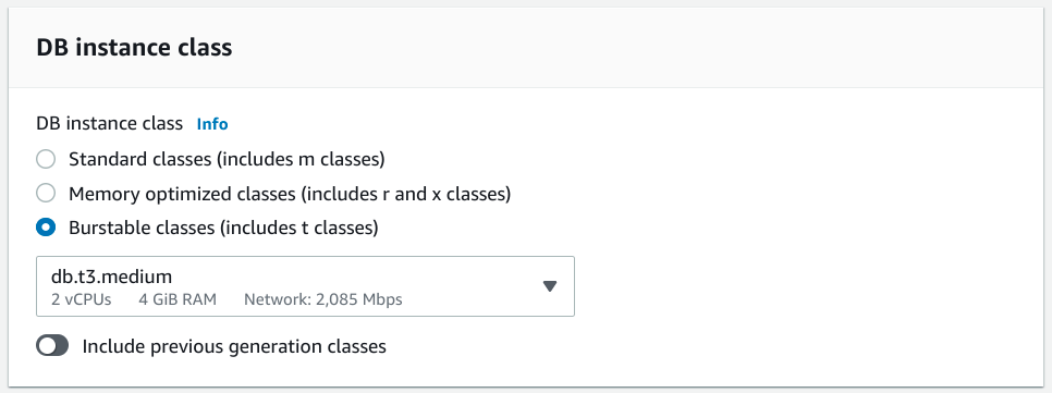 具體來說,如果您剛開始,像 db.t3.medium 這樣的例項(提供 2 個 vCPU 和 4 GiB 記憶體)對於許多用例來說是一個很好的基線選擇。CPU 應該能夠處理中等水平的活動,同時應對請求峰值。假設硬體效能適合您的專案,您可能會遇到的第一個限制是 2,086 Mbps 的網路上限,因此在做出決定時請記住這一點。