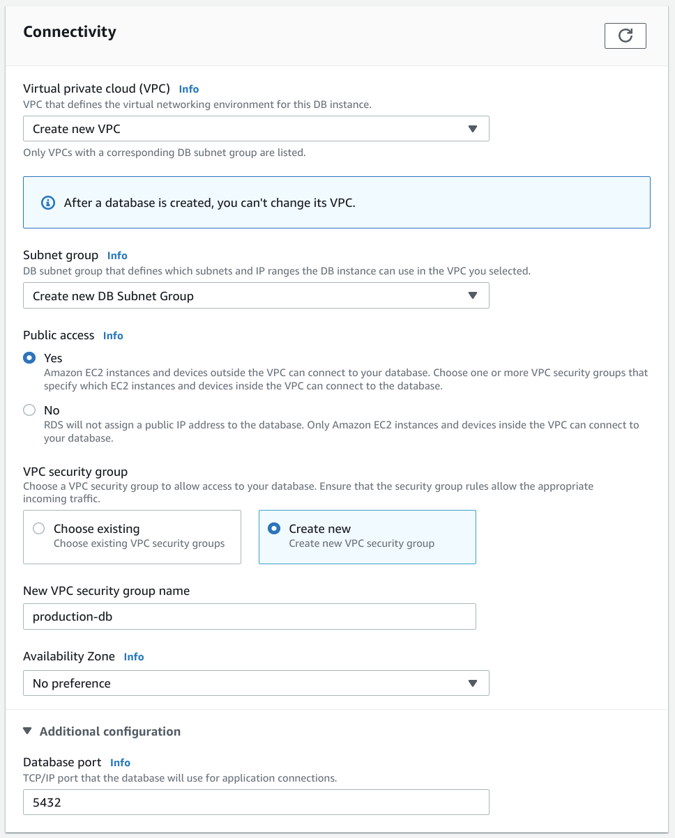 您必須做出的最重要選擇之一是是否允許公共訪問您的資料庫例項。這主要取決於您的安全要求以及您為資料庫配置特殊訪問許可權的能力。