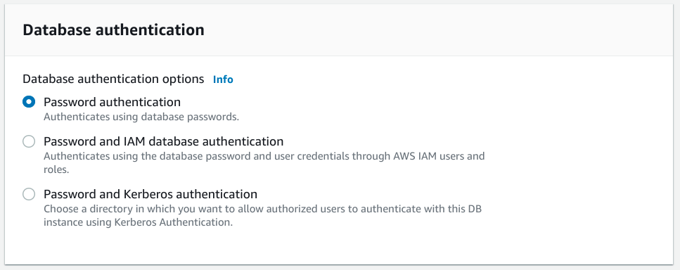一般來說,除非您需要更復雜的配置,否則僅使用密碼認證是合理的。如果您深度依賴 AWS 生態系統併為基礎設施的許多其他部分使用基於 IAM 的認證,那麼 IAM 資料庫選項可能很有吸引力。除非您已經將 Kerberos 服務用於其他目的,否則不值得選擇 Kerberos 選項。