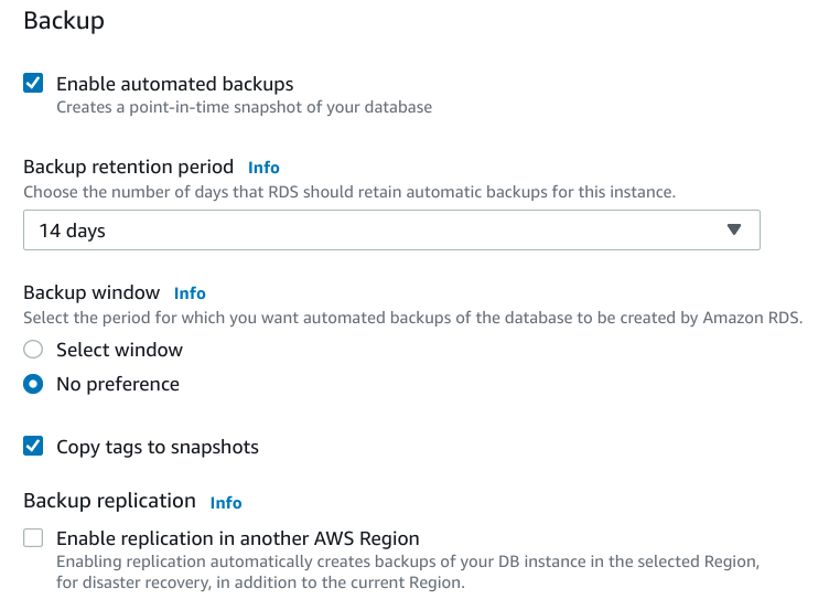 如果您想啟用自動備份,請勾選啟用自動備份框。這將告訴 AWS 自動為您的資料庫例項拍攝每日時間點快照,您可以使用這些快照進行恢復。值得注意的是,雖然本頁未提及,但備份將儲存在 AWS 的簡單儲存服務 (S3) 中,您將需要為它們消耗的空間付費。