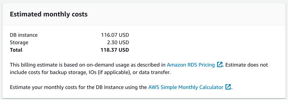 我們終於完成了配置過程。在頁面底部,您可以看到已配置資料庫例項的每月成本估算