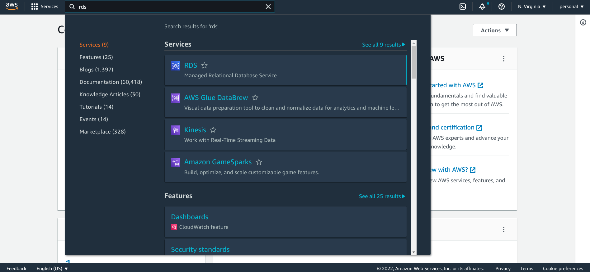 在 AWS 控制檯主頁,在服務搜尋欄中輸入 rds 以找到 RDS 服務