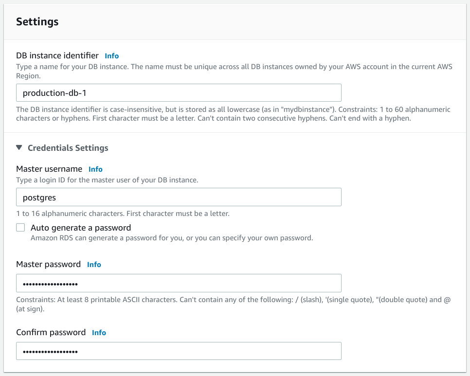 接下來,配置您的資料庫例項的憑證。首先設定您的 PostgreSQL 資料庫的主使用者名稱。預設情況下,大多數 PostgreSQL 客戶端工具假定主使用者名稱為 postgres,因此如果合適,您可以保留該使用者名稱。