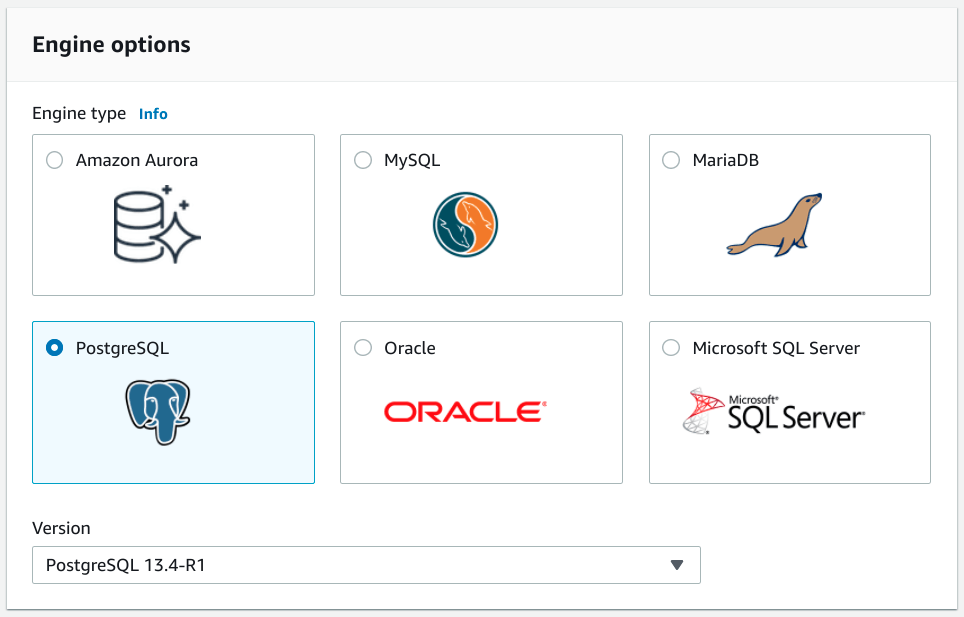 在本指南中,我們將配置一個 PostgreSQL 資料庫,因此我們將選擇 PostgreSQL 選項。Amazon 的 Aurora 是一個 PostgreSQL 相容的替代選項,提供 Amazon 自有的擴充套件和管理功能。然而,在本指南中,我們將專注於 PostgreSQL 原生部署。