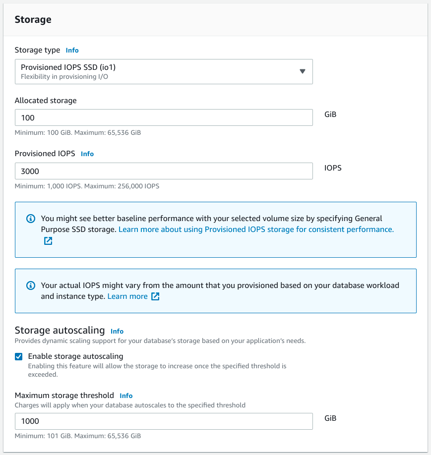 通常,初始分配從 20 到 100 GiB 之間就足夠了(通常取決於什麼能為您提供足夠的 IOPS),然後將您的最大儲存閾值設定為您願意支付的最大大小。